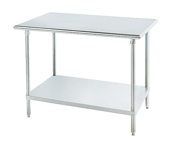 Under-shelves are constructed of 14 ga. type 304 series stainless steel and feature stainless steel legs and stainless steel adjustable under-shelves. Tops have 4 rolled-rim edges and bull nosed corners. Includes 1" adjustable metal bullet feet. Shipped KD. FOB Shipping Point.